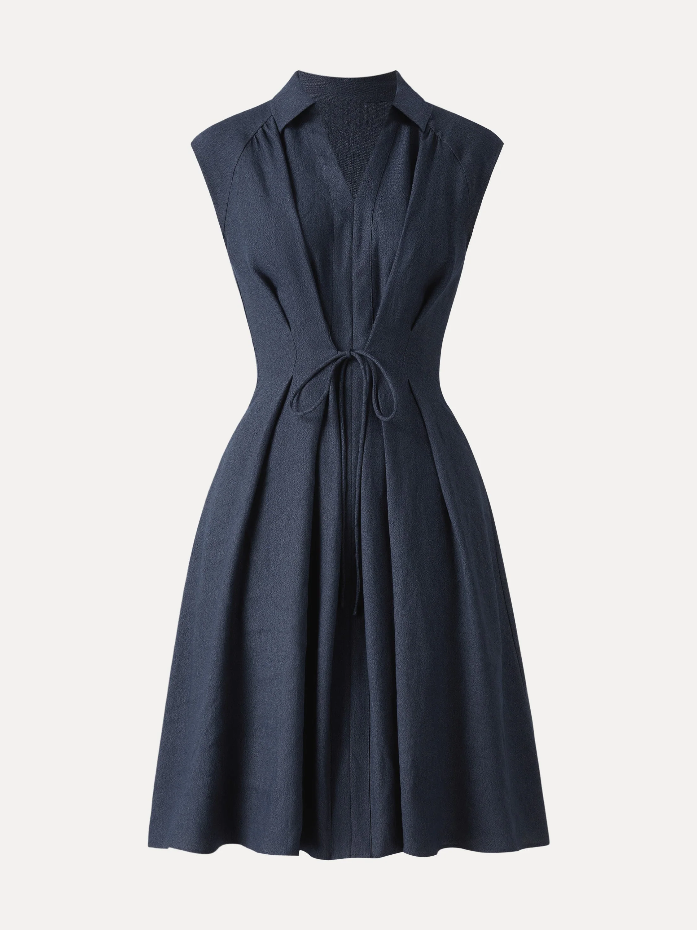 -70%Viscose-Linen Collared V-neck Midi Dress with Drawstring—